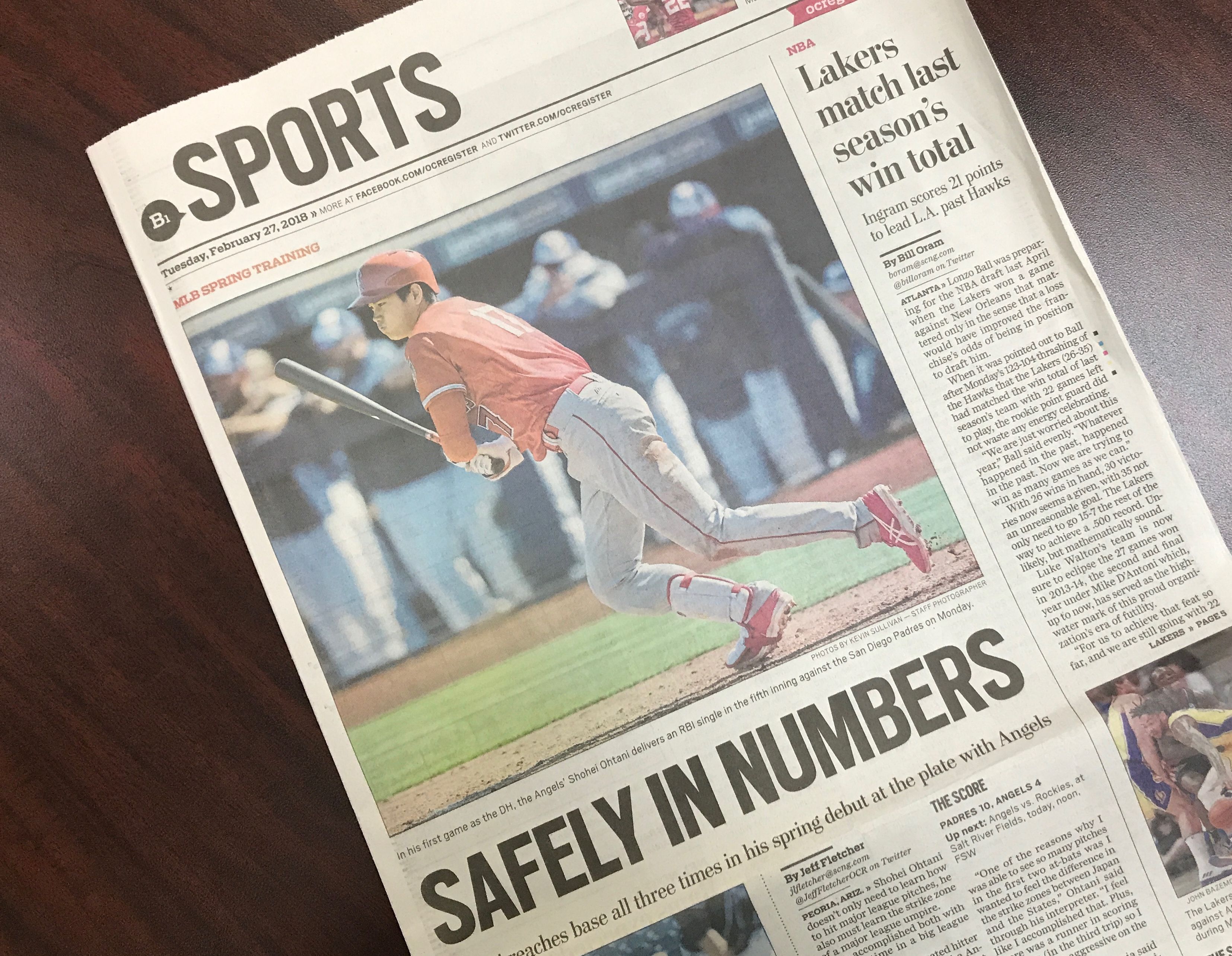現地2月27日、地元紙OC Registerは前日の大谷の打者デビューを受け、スポーツ面だけでなく、本紙トップでカラー写真とともに掲載した。本紙のトップにスポーツのネタが来るのは、よっぽどの関心事のみ。ワールドシリーズやオリンピックですら、なかなか本紙トップに持ってくることはない。日本語訳を紹介したい。