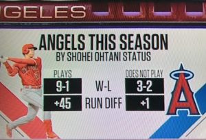 ESPNのニュースで言っていたが、ここまで大谷が投手か打者で出た10試合は9勝1敗で、総得失点差はプラス45と圧倒的な存在感を放っている。一方、大谷が出ていない5試合は3勝2敗で、総得失点差はわずかにプラス1である。大谷効果はとてつもなく大きいということがデータでも証明されている。