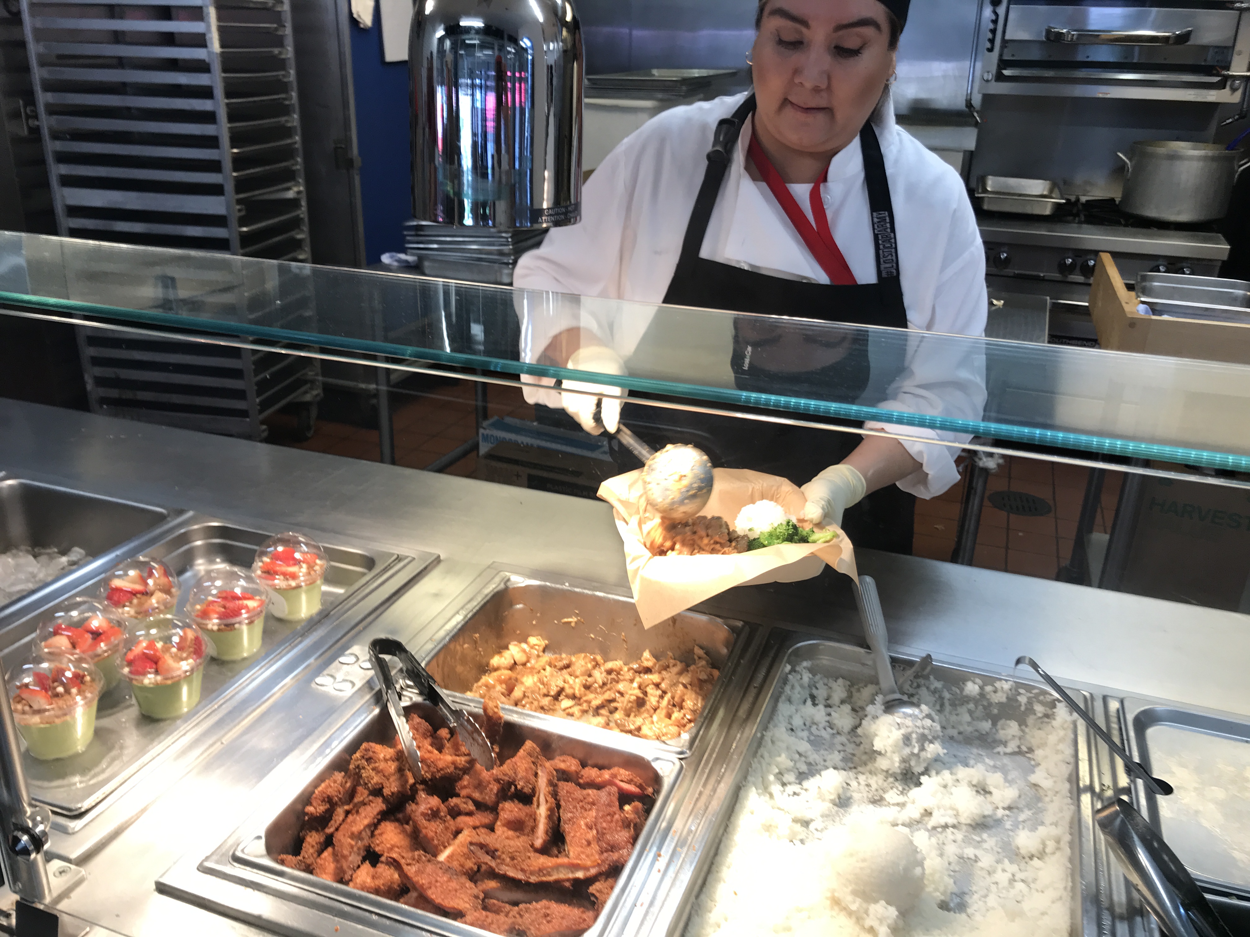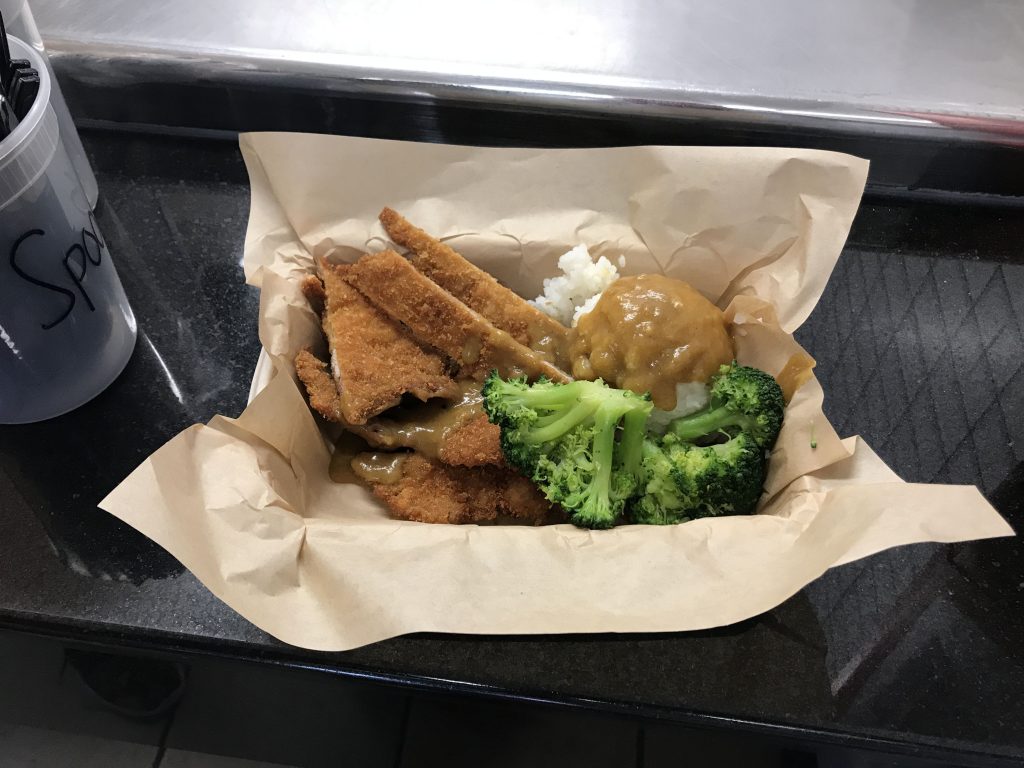 カツはハムカツのように薄い。ご飯はアメリカにありがちなやや水が多めで、日本のご飯とは違い米粒がハッキリしていない。ブロッコリーの付け合せはアメリカではとても多い。しかもほとんど生に近いこともあるのだが、ここのはちゃんと茹でて柔らかくなっていた。とてもアメリカ的なのだが、味としてはまずまずだろう。