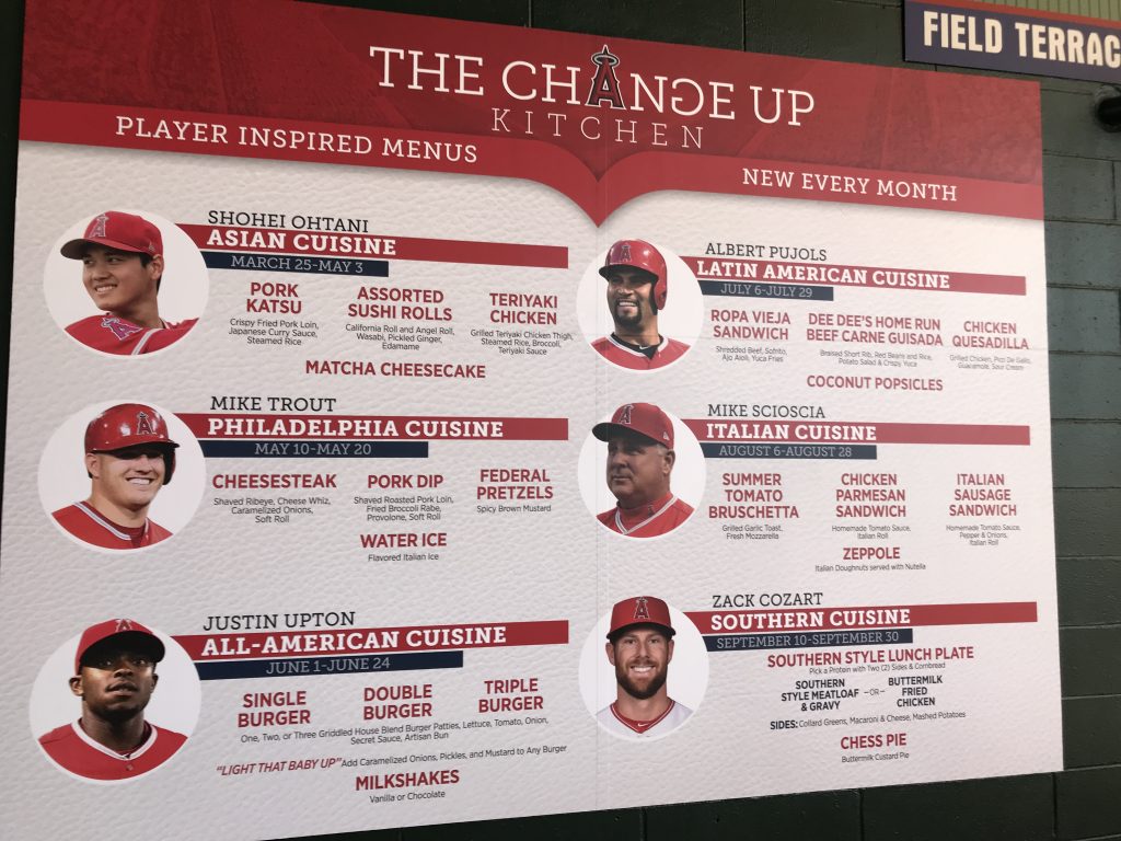 エンゼルスタジアムの「The Change Up Kitchen」という売店では毎月、特定の選手をインスパイアしたメニューを月替りで出している。場所は226ブロック(1塁側2階)。