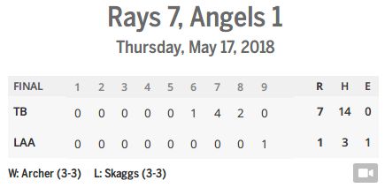エンゼルスの先発スカッグス、レイズの先発アーチャーがともにナイスな立ち上がり。静かに序盤は過ぎていく。5回を終わってエンゼルスが2安打、レイズは3安打と投手戦だ。スカッグスは6回、元エンゼルスのクーロンにソロホームランを浴びてしまう。