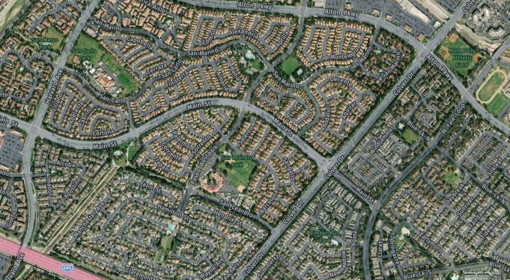 下の航空写真を見ていただければわかるとおり、アーバインの街は道路に囲まれたエリアごとに面開発されている。日本の街並みのように意匠もサイズもバラバラの家が立ち並ぶことはなく、各区画ごとに決められたデザインの元に計画的に開発が進められてきた街なのである。