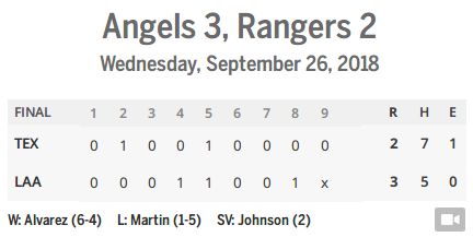 9回表、ジム・ジョンソンが3人で締めくくって、エンゼルスはレンジャースをスイープ。良い試合だった。