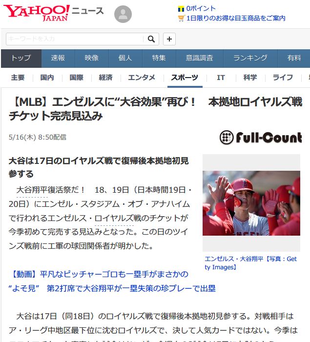 Yahooのニュースで「エンゼルスに“大谷効果”再び!本拠地ロイヤルズ戦チケット完売見込み」という記事が出た。しかしだからと言って、球場がエンゼルスファンで満員になることはまずないだろう。おそらく7割くらいの入りではないかと思う。「チケット完売」と「球場が満員」では意味合い全く違うのだ。