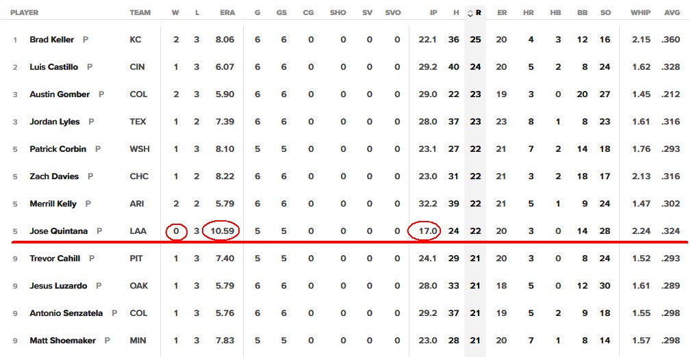メジャーの投手ランキング調べてみるとキンターナの総失点22はメジャーでワースト5位タイだが、他の投手はみんな20イニング以上投げてるから!少なくとも1勝はしているから!防御率はヒト桁だから!キンターナが現在メジャー最悪の先発投手であることは疑いようがない。