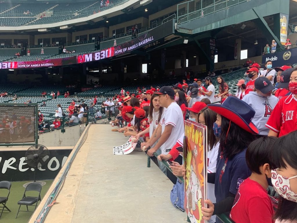 今日は大谷のブルペン投球を見ようと試合開始の1時間半前にはゲートに並んでほぼ一番で入場。そのままレフト後方のブルペンへ直行した。エンゼルスタジアムでは試合開始直前までは誰でもブルペン横のエリアへ入る事を許してくれる。おかげでブルペンを見るには絶好の場所を確保した。