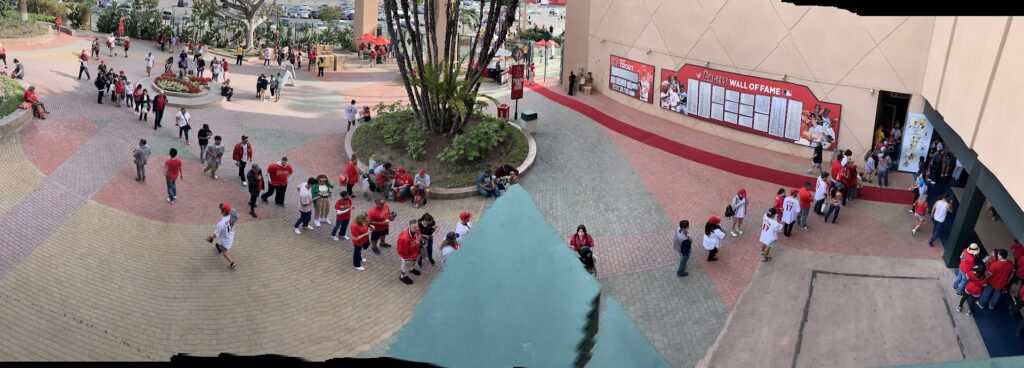 大谷は背中の張りで先発から外れたが、今日は大谷のスターウォーズボブルヘッドがもらえる日。チケットは2週間前には完売でこんなことは極めて珍しい。転売サイトでは元々12ドルくらいのチケットが70ドル以上の値段になっていた。ファンの出足は早く開門前にはボブルヘッドを求めて長い列が出来ていた。またチームストアも入場制限で長蛇の列。
